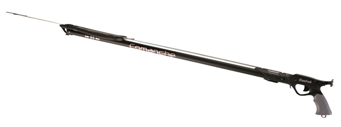 L'arbalète Comanche deriva dalla lunga esperienza acquisita dalla Cressi con la mitica serie Apache. Sono stati impiegati nuovi tecnopolimeri dell'ultima generazione per realizzare impugnatura e puntale, materiali che abbinano alla leggerezza una grande rigidità e resistenza meccanica. Ne deriva una minore flessibilità dei materiali e, di conseguenza, una maggiore precisione di tiro. Il puntale è molto compatto, sottile e idrodinamico. Il punto di aggancio degli elastici è abbassato e l'asta è perfettamente allineata con gli elastici. La visibilità offerta dalla testata è eccellente e il puntamento risulta preciso e veloce. Nuovi anche gli alloggiamenti su entrambi i lati del puntale per il passaggio della sagola e un nuovo guida-asta, collegato alla testata, di dimensioni ridotte, per accompagnare l'uscita dell'asta senza sbalzi. Nella parte inferiore è presente l'alloggiamento per un secondo elastico. L'impugnatura presenta nella parte anteriore un lungo guida-asta che garantisce nel momento dello sgancio un'ottima precisione di tiro. Vi sono ben 4 sganciasagola: due laterali, con dentini di nuovo tipo, che assicurano una buona tenuta della sagola e, al tempo stesso, un facile rilascio della stessa al momento del tiro. Vi è poi uno sganciasagola meccanico, che viene liberato dall'uscita dell'asta e un quarto anteriore, posto sotto la canna. La parte posteriore dell'impugnatura termina con un comodo appoggio sternale, che facilita le operazioni di caricamento. Il calcio è realizzato in morbido materiale rubbersoft per una presa sicura e confortevole. Dalla parte inferiore del calcio fuoriesce un robusto anello di aggancio per il sagolone. E' dotato di un manettino maggiorato di riavvolgimento e di un'ottima frizione, veramente progressiva ed efficace. Il sistema di aggancio al fucile avviene tramite slitta a coda di rondine, posizionata in modo T.