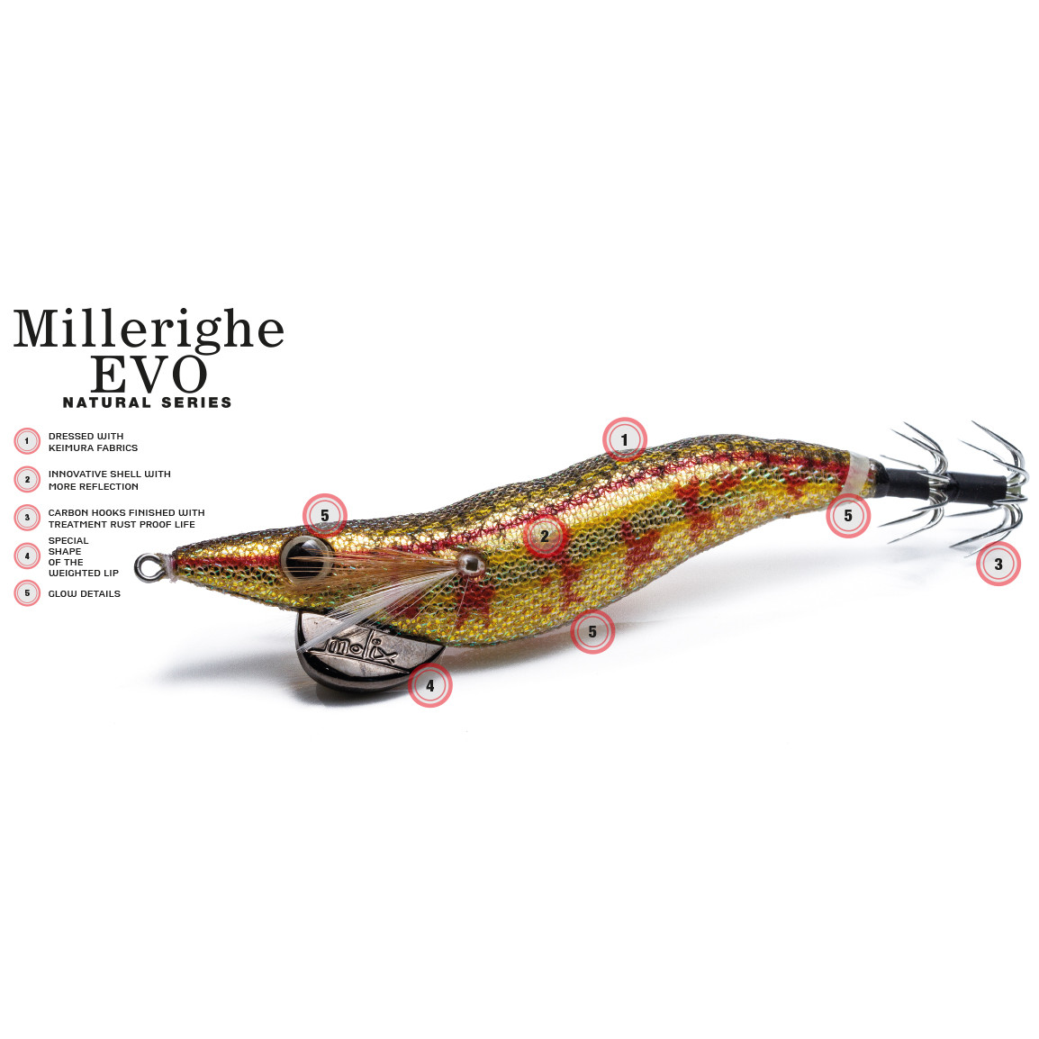 Scopri la nuova frontiera della pesca con il Millerighe Natural Series. Sagomato, dressato, armato e prodotto con materiali di prima qualità, il Millerighe EVO Natural Series è progettato per essere versatile e facile da usare. Il Millerighe EVO introduce innovativi gusci con più riflessi. Sono rivestiti con i tessuti Keimura, filato in grado di conferire all’esca maggiori tonalità e riverberi sensibili ai raggi UV. I cestelli di aghi in carbonio sono rifiniti con un trattamento speciale anti di ruggine e corrosione a lunga durata. Sono stati migliorati ed adattati alle dimensioni dell’Egi per ottenere un assetto migliore anche nelle condizioni più difficili e garantire massimi risultati in termini di catture. Gli occhi con il contorno luminescente e il margine inferiore dell’esca glow migliorano l’aspetto del Millerighe EVO Natural Series e le sue prestazioni anche in condizioni di scarsa luminosità. La speciale forma del lip in piombo, progettato esclusivamente per Molix, offre un’azione irregolare ed un perfetto bilanciamento dell’esca.